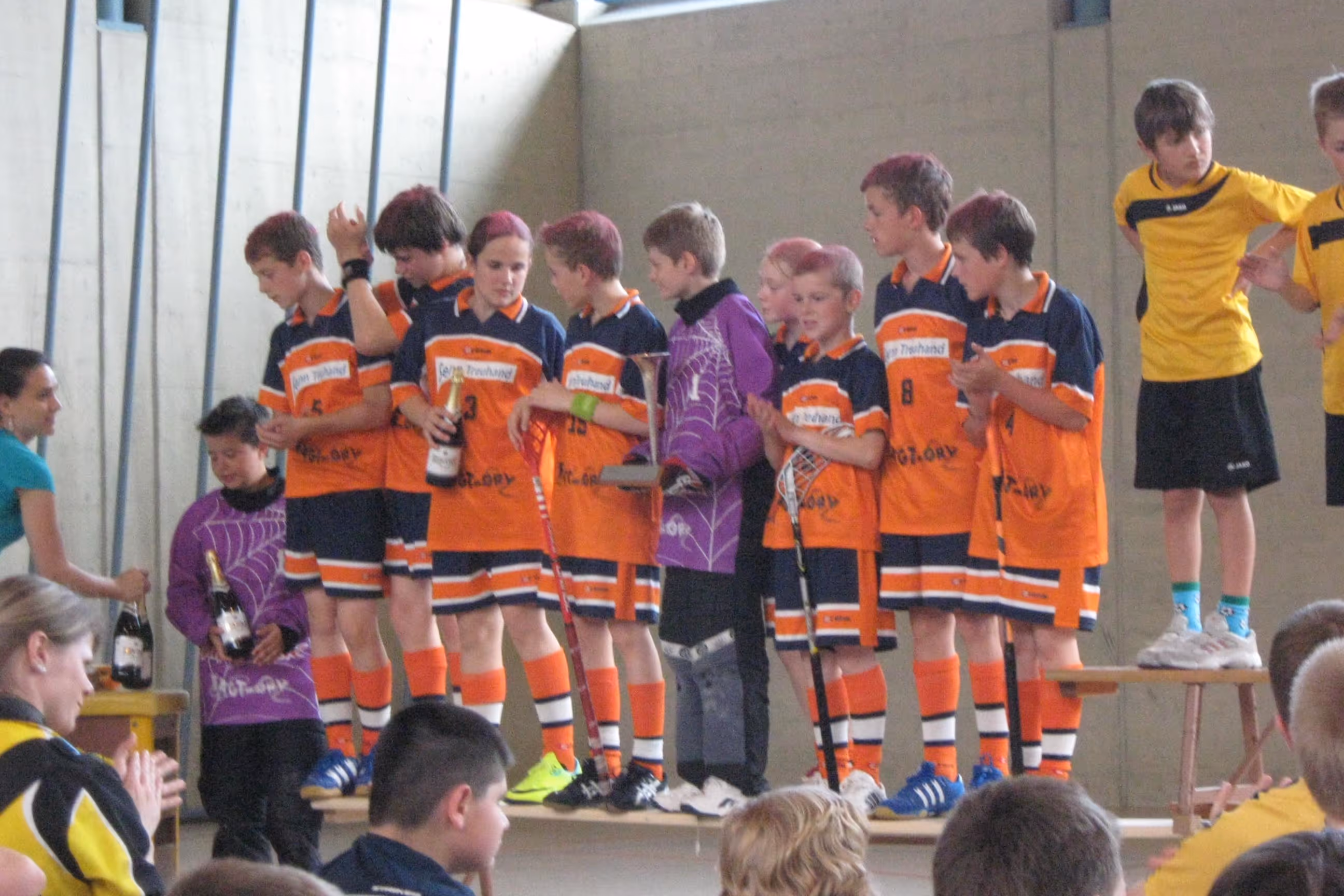 Den zweiten Rang musste man aber hart erkämpfen. Die Vorrunde konnte mit vier Siegen überzeugend abgeschlossen werden. Im Viertelfinal gegen Zofingen lief es lange nicht so gut und es wurde am Schluss ein 5:3 Zittersieg für das Fägy-Team. Man spürte der Mannschaft die steigende Nervosität an. Umso erstaunlicher war dann der hohe und klare Sieg im Halbfinal gegen das Team aus Hallau. So kam es zum Final-Duell gegen Schaffhausen. Das vorhergehende pinkige Besprayen der Haare und der Einlauf mit Musik und Starting 4 waren sicherlich speziell und werden nicht so schnell vergessen. Leider reichte es dann im Spiel selber nicht mehr, um den ganz grossen Titel zu feiern. Obwohl das Fägy-Team sehr gut zusammenspielte und sich grosse Chancen erarbeitete, reichte es am Schluss nicht ganz. Ein sehr guter Einzelspieler von Schaffhausen und etwas Pech (je ein Latten- und ein Pfostenschuss) trugen zur Finalniederlage bei. Trotzdem feierte das U13 Team den Vize-Schweizermeister-Titel ausgiebieg mit Rimuss, McDonalds und allem was sonst noch so dazugehört.